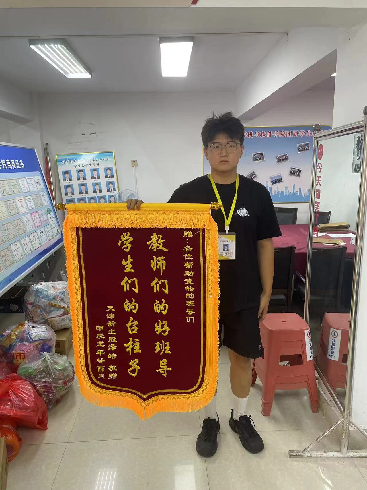 本网讯(学生记者/鲁博文)近日,计算机与软件学院学生会收到新生送来的一份特殊礼物——一面印有“教师们的好班导,学生们的台柱子”的锦旗。24级新生小殷同学用这种特别的方式表达了对新生班导23软工安全专业李博文、鲁博文同学的感谢。
