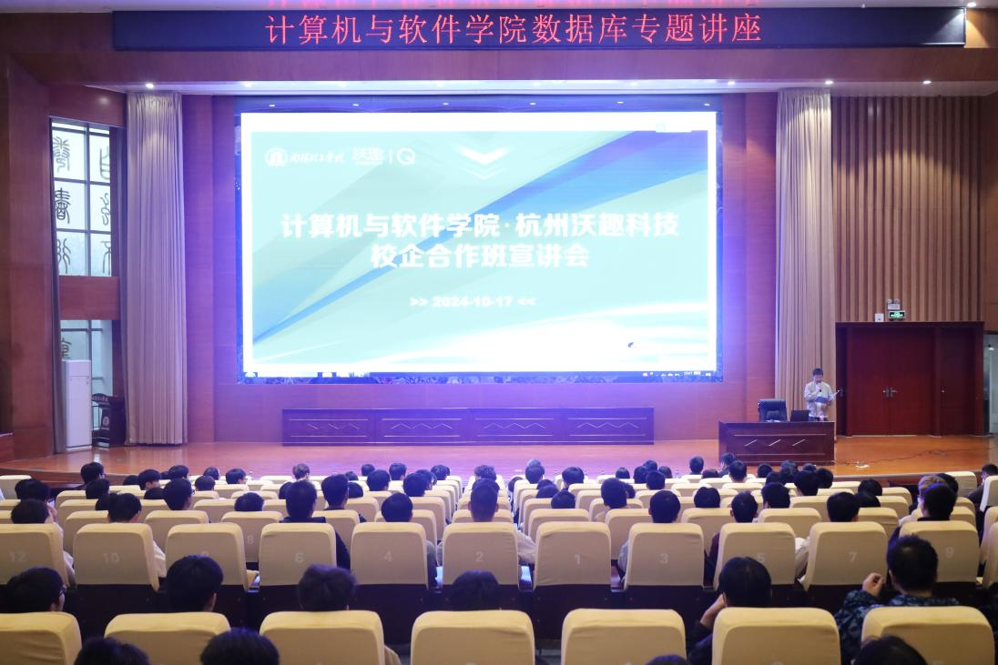 本网讯(特约记者/闫恒瑜)10月17日,计算机与软件学院邀请杭州沃趣科技在我校第三报告厅举办校企合作班宣讲会。杭州沃趣科技股份有限公司CTO魏兴华、服务中心总经理王显伟、高级培训发展专员潘飞宏、学院领导班子成员以及400余名师生代表参加此次活动。