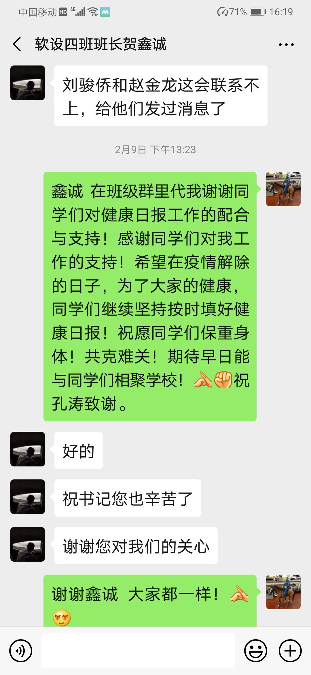 新型冠状病毒疫情,牵动着每一个中国人的心,大疫当前,疫情就是命令,防控就是责任,为做好疫情防控工作,软件学院全体辅导员在院党委领导下,在校学生处、校团委的指导下,充分发挥示范引领作用,迅速从“假期模式”转入“战时状态”,做到守土有责、守土负责、守土尽责。一通通电话,一段段文字、一次次询问、一遍遍叮嘱、一条条宣传、一天天排查…不论身在何地、人在何方,不畏艰险、牺牲假期,奋战在防控工作前线,积极把权威的防控知识、贴心的关怀、乐观的勇气带给每一位软件学子,与他们共渡难关,共待春暖花开。