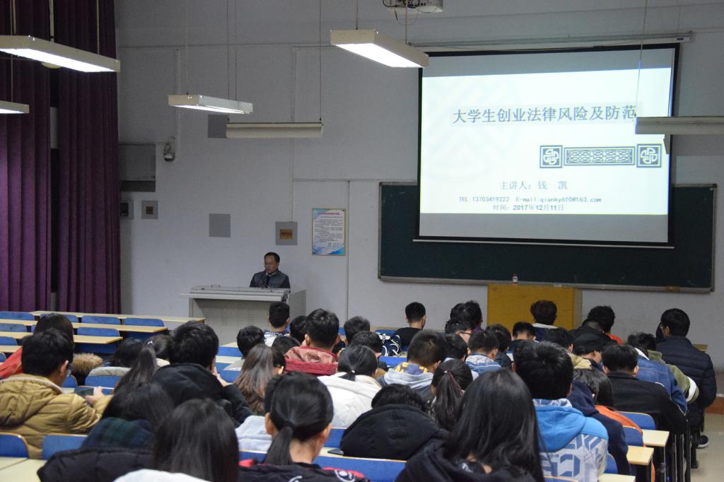本网讯(学生记者/胡欣茹)12月11日晚七点,“大学生创业中的法律风险及防范”专题讲座在14教106成功举办。本次讲座由钱凯老师主讲,大一近百名同学到场参加。