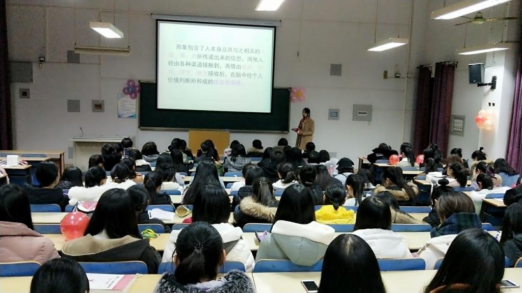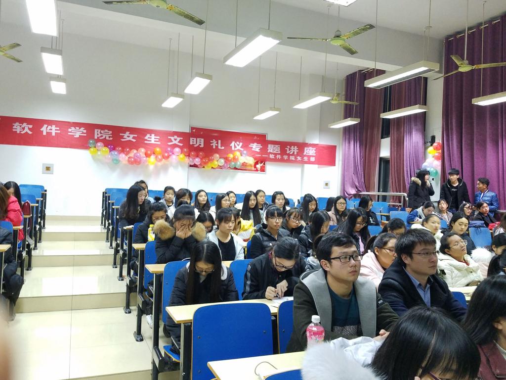 本网讯(学生记者/胡欣茹)11月30日晚7点,软件学院女生文明礼仪专题讲座于14教204成功举办。本次活动由经管学院的卢丹丹老师主讲,软件学院女生部主办,软件学院大一全体女生到场参加。