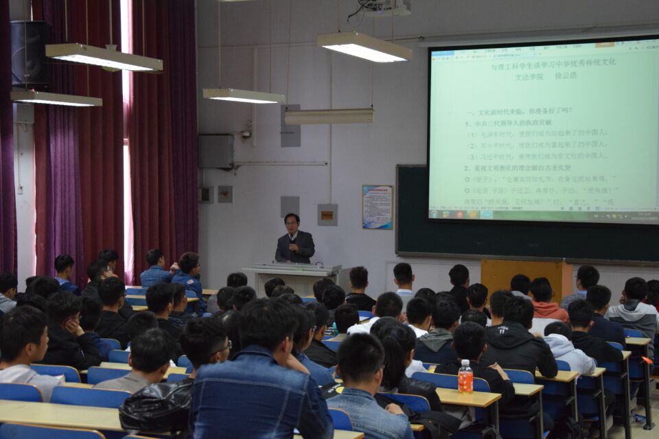 徐教授通过历史故事、生动案例、影音资料等方式与同学们畅谈了中华文明的优秀传统文化对一个人道德品行塑造的影响,他指出文化就是“以文化人”,高尚的道德并不是要做出什么惊天动地的事情,而往往是表现在日常的行为习惯中。如在待人接物中做到“温、良、恭、俭、让”,在处理人际关系时要“恭、宽、信、敏、惠”。我们播下一个行动,便收获一个习惯;播下一个习惯,便收获一个品格;作为新时代的大学生,应时时刻刻与礼貌交谈,千万不要把行为习惯看作小事。“不知礼,无以立也,不知言,无以知人也”。每个人的举手投足之间都传递着丰富的信息,让我们从此刻做起,从自我做起,从点点滴滴的小事做起,养成良好的道德习惯。最后,徐教授还建议同学们读一读中国推荐给联合国的十本书,《诗经》,《论语》,《孟子》,《老子》,《庄子》以及《史记》,《全唐诗》,《红楼梦》,《鲁迅全集》等,还有南阳人的骄傲大哲学家冯友兰的《中国哲学史》。