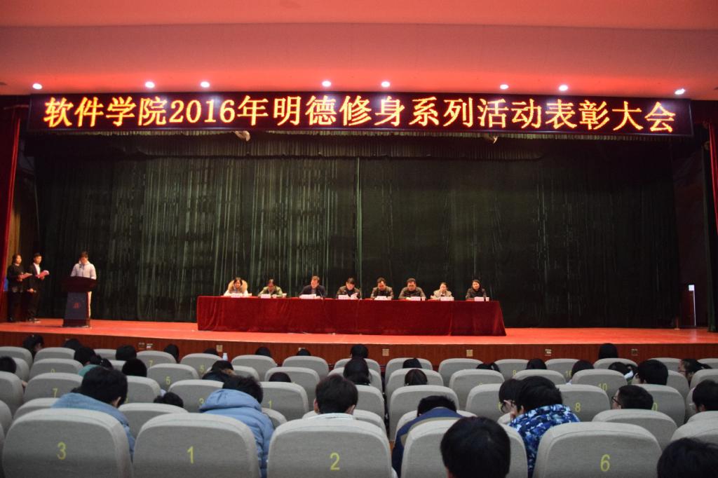 本网讯(学生记者/魏鹏)12月20日,软件学院2016明德修身表彰大会在毕业大厅隆重举行。我院党委书记牛军科,党委副书记祝孔涛及多位辅导员出席大会。祝孔涛主持本次大会。