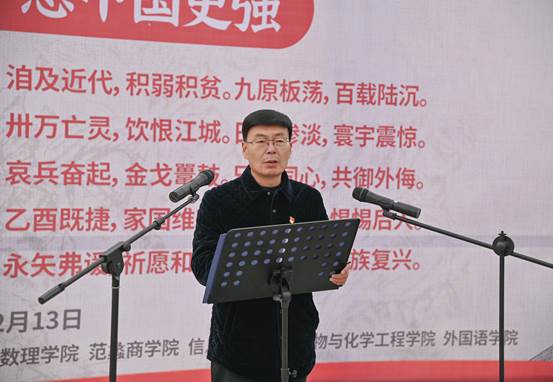 张伟指出,八十三年前的今天,侵华日军野蛮侵入南京,制造了惨绝人寰的南京大屠杀惨案,这是人类历史上最黑暗的一页。令人感动的是,在南京大屠杀那些腥风血雨的日子里,我们的同胞守望相助、相互支持,中国人民和中华民族不畏强暴、中国人民没有屈服,而是凝聚了同侵略者血战到底的空前斗志,坚定了抗日救国的必胜信念。八十三年后的今天,在中国共产党的领导下,全国各族人民同心同德,艰苦奋斗,取得了令世界瞩目的伟大成就。今天,我们在此举行纪念活动,全校师生将以沉重的心情缅怀逝者,唤起每一个善良人们对和平的向往和坚守,是一堂生动的爱国主义教育课。青年是国家和民族的未来,希望广大青年勇于拿起接力棒,以奋斗者的姿态为实现中华民族伟大复兴的中国梦而不懈努力。