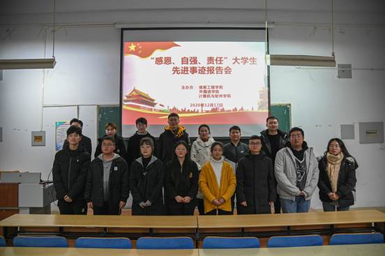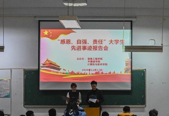 本网讯(学生记者/黎志强 摄影/张明)为进一步宣传党和国家资助政策与成效,激励广大学生奋发自强、立志成才、感恩奉献,促进“解困—育人—成才—回馈”的良性循环。12月17日晚,计算机与软件学院联合外国语学院及信息工程学院于14教106教室举办“感恩·自强·责任”大学生先进事迹报告会。
