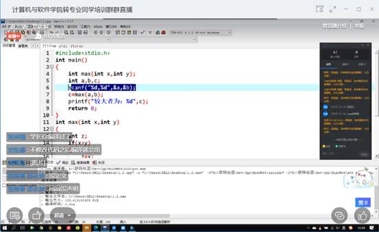 本网讯(特约记者/陈可)1月13日,计算机与软件学院大学生科技园组织精干力量为转专业学生开展为期4周的线上C语言培训,以补齐他们的专业短板,为下学期专业课程学习打下基础。