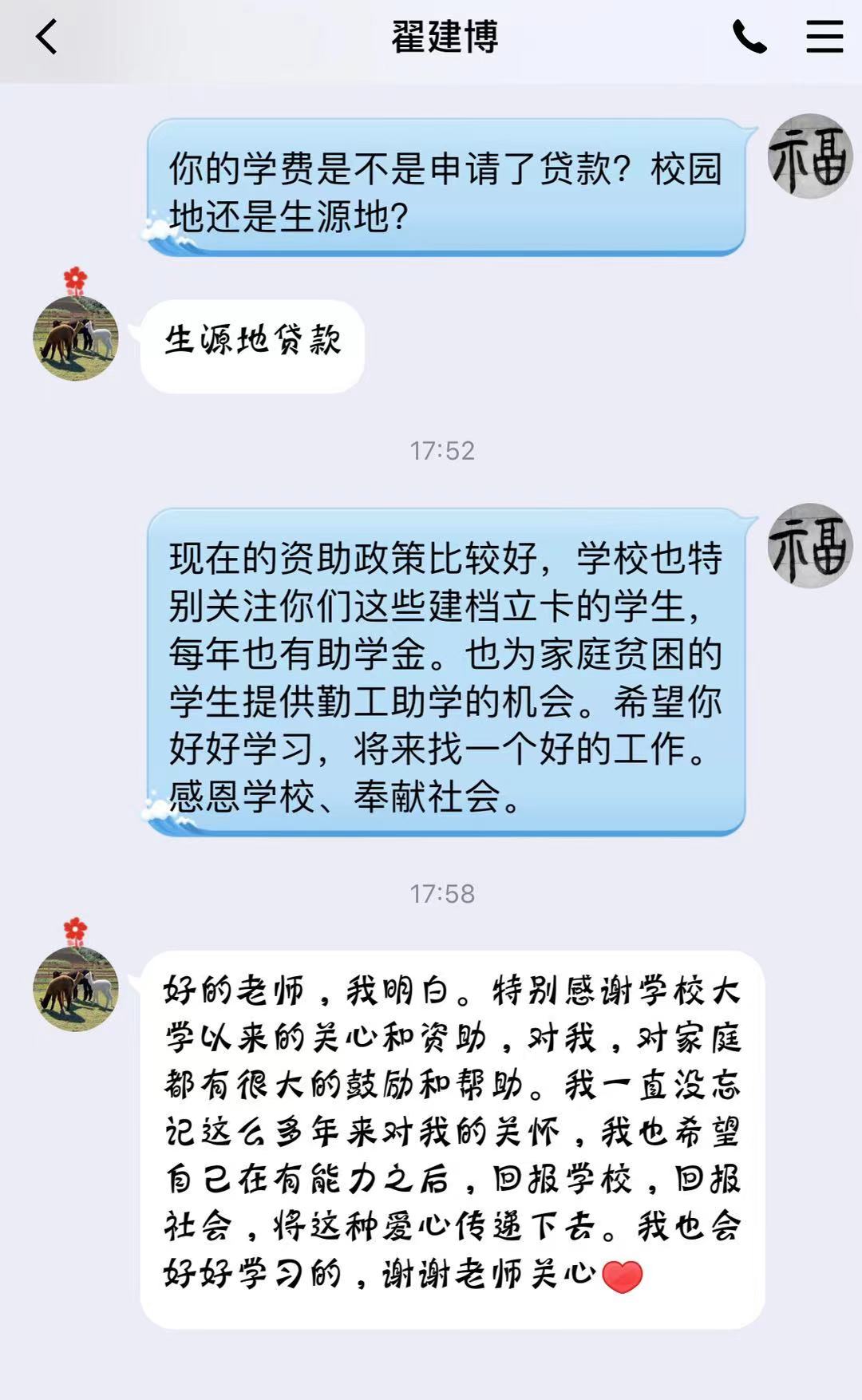 走访中,18、19、20级辅导员老师全员参与,通过电话语音、微信视频等方式与学生和学生家长进行线上交流,深入了解经济贫困学生家庭存在的困难及受疫、暴雨灾害影响情况,并向学生及家长讲解介绍了国家、学校针对贫困生的各项奖助贷政策和资助育人理念,听取了学生家长对学校及学院资助工作的意见和建议,同时就学生在校的思想、学习、生活等情况和学生家长进行了沟通与交流,为他们送去了学院领导的深切关怀,并告知他们如遇问题可以通过打电话或发微信联系老师,学院会最大限度的给予帮助。