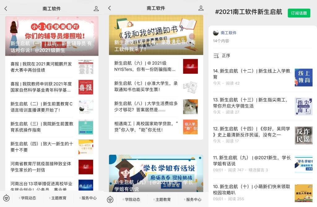 学院通过“南工软件”微信公众平台持续发布“新生启航”教育系列推文,内容涵盖理想信念、校情院情、师生祝福、校园生活、心理健康等方面,帮助新生进一步熟悉大学学习和生活,树立新的奋斗目标,实现成长中的角色转变,截至目前系列推文已发布十余篇,覆盖学院3000余学生。