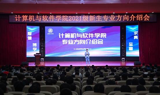 本网讯(学生记者/崔建明) 10月14日晚,计算机与软件学院在毕业大厅举办2021级新生专业方向介绍会。学院领导班子、各专业负责人、辅导员以及2021级新生共同参加此次大会。大会由学院副院长郑珂主持。