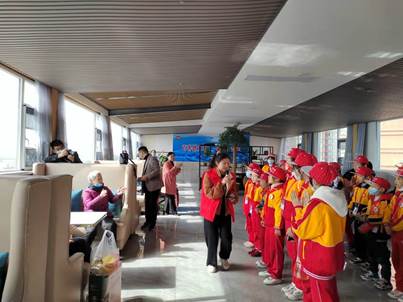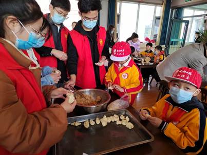 在日间照料中心的休闲康复室,学院同学们和市九小的少先队员们一起为老人们带来精心编排的文艺节目,大学生们的戏剧独唱和少先队员们的合唱受到老人们的热烈欢迎。随后志愿者一起为老人们包饺子,让他们感受到温暖和关怀,志愿者们也在老人们讲述的过去故事中感受祖国的变化与发展,凝聚起矢志奋斗的青春理想。