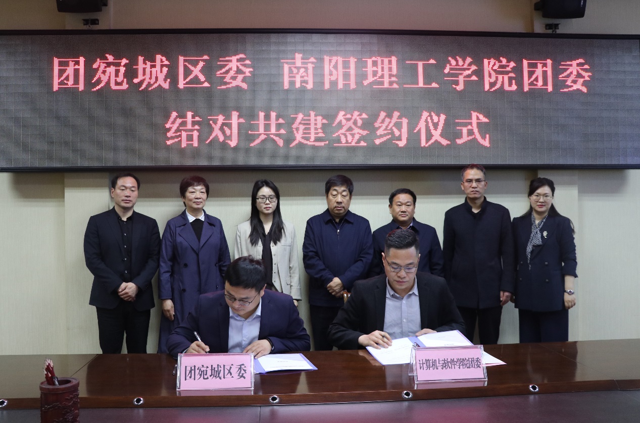 本网讯(特约记者/曾智学生记者/喻帅)3月15日上午,我校计算机与软件学院团委与共青团宛城区委在中込会馆举行“结对共建”签约仪式。团市委书记杨文杰、宛城区副区长王一硕、宛城区政协副主席马晓良、团宛城区委书记庞彦漭、我校副校长肖泽昌、计算机与软件学院负责人等出席本次签约仪式。仪式由我校团委书记郭兴华主持。