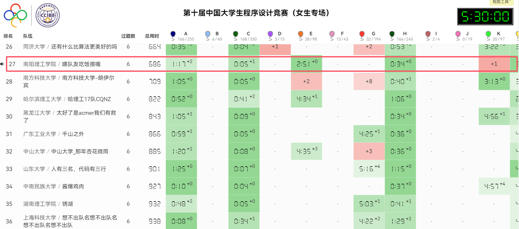 本网讯(特约记者/陈可)11月11日,2024年中国大学生程序设计竞赛女生专场成绩揭晓。本次比赛由中国大学生程序设计竞赛组委会主办,重庆对外经贸学院承办。大赛吸引了上海交通大学、武汉大学、浙江大学、吉林大学等全国160余所院校的507名选手报名参加。经过5个小时的比赛,我校学子凭借精准的逻辑推理和高效的编程实现,解决了多个复杂问题,展现出了扎实的编程基础和出色的团队协作能力,其中来自我校计算机与软件学院、数理学院的陈诗曼、陈双、孟令婷、陈泺冰、王圆圆、徐萌所组成的代表队获得两枚银牌,陈玥如、宋雨静、张瑞婷、赵静冉、吴曼琳、史嘉琳所组成的代表队获得两枚铜牌,我校排名全国高校第27位。