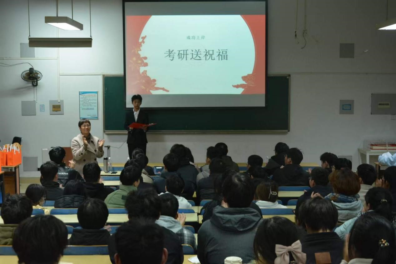 活动现场气氛热烈非凡,处处洋溢着浓浓的情谊。低年级学生率先以青春的热情送上了真挚的祝福,他们饱含深情的话语汇成暖心视频,倾诉着对学长学姐们的钦佩与期待。一句句 “成功上岸,一战成硕” 如同一束束温暖的光,照亮了考研学子前行的道路。随后,老师们将精心准备的礼品送到考研学子手中,这些礼品虽不昂贵,却饱含着深深的心意,承载着大家对考研学子的关爱与支持。