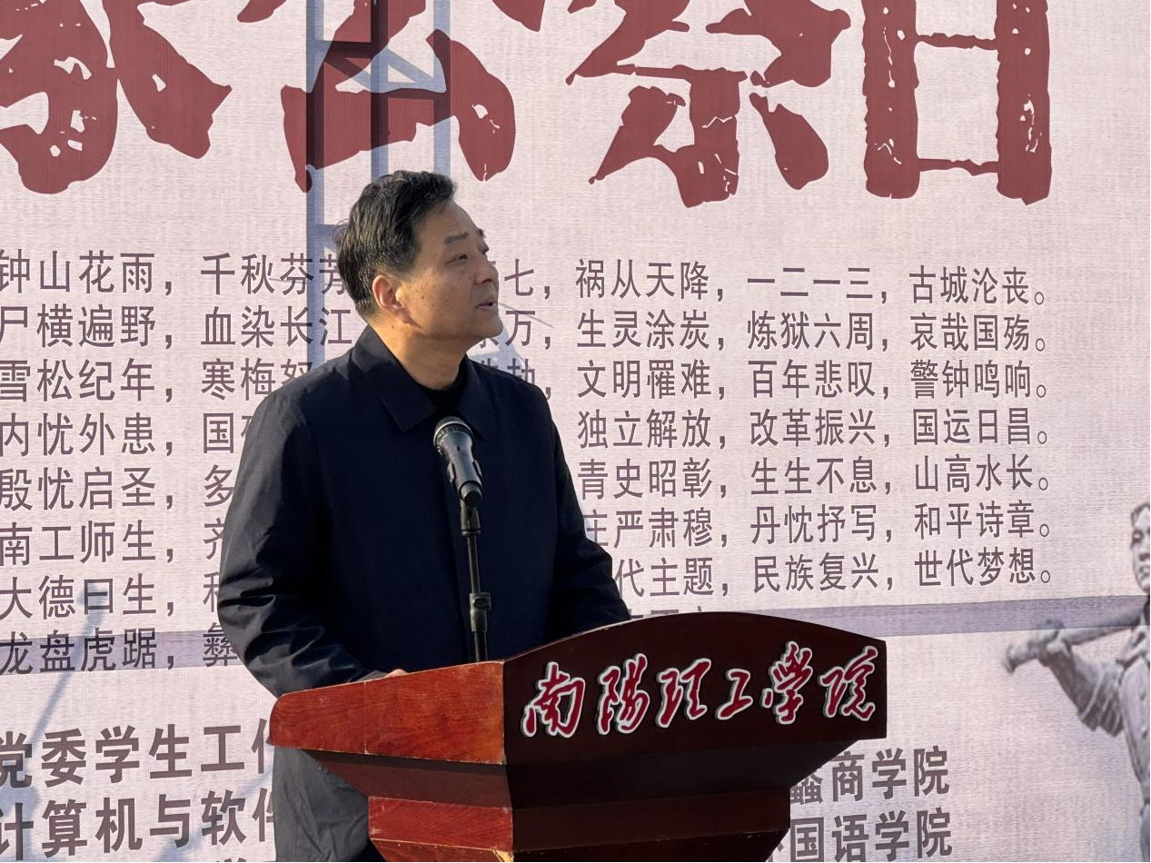 董豪指出,八十七年前的今天,侵华日军野蛮侵入南京,制造了惨绝人寰的南京大屠杀惨案,这是人类历史上最黑暗的一页。在中国共产党的号召和引领下,在全民族各种积极力量共同行动下,中华儿女同仇敌忾,视死如归,前仆后继,共御外敌。经过14年艰苦卓绝的浴血奋战,中国人民付出了伤亡3500万人的沉重代价,赢得了抗日战争伟大胜利。他表示,今天我们在此举行纪念活动,全校师生以沉重的心情缅怀逝者,唤起每一个善良的人们对和平的向往和坚守,是一堂生动的爱国主义教育课。新时代新征程上,作为青年大学生,要在推进强国建设、民族复兴伟业中展现青春作为、彰显青春风采、贡献青春力量。
