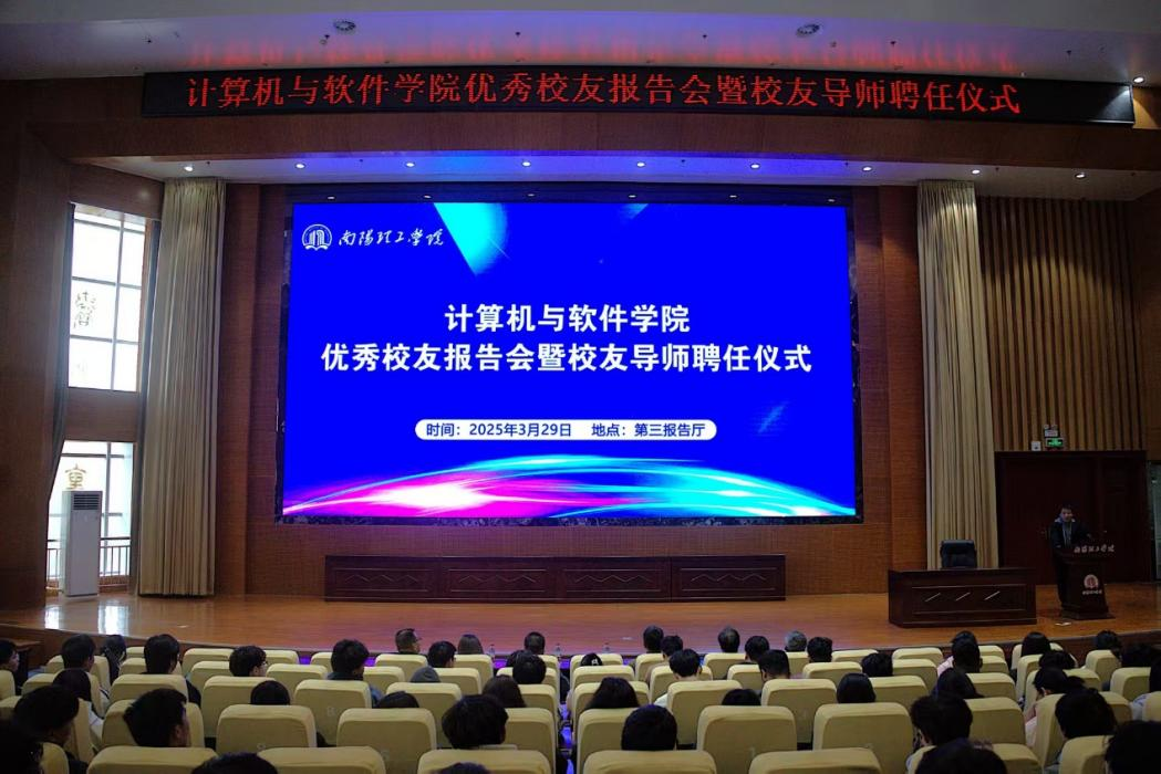本网讯(学生记者/李明亮)3月29日,计算机与软件学院在第三报告厅举办了“优秀校友报告会暨校友导师聘任仪式”。本次活动邀请了段玉洋、李文怡、祝峰、张玉国四位优秀校友。招生就业处处长祝孔涛、学院领导班子、师生代表参加活动。