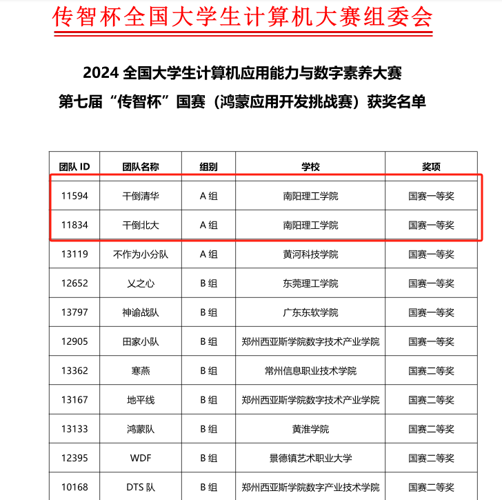 2025年4月21日,由全国高等院校计算机基础教育研究会主办的第七届“传智杯”全国大学生计算机应用能力与数字素养大赛全国总决赛圆满落幕。本届大赛作为全国大学生计算机应用能力与数字素养大赛的核心赛道,吸引了全国500余所高校的近万名学子参与,经过激烈角逐,最终200余名选手在11个专业赛项中脱颖而出。据5月8日发榜结果,我院学子在鸿蒙应用开发挑战赛道,荣获国赛A组一等奖2项。