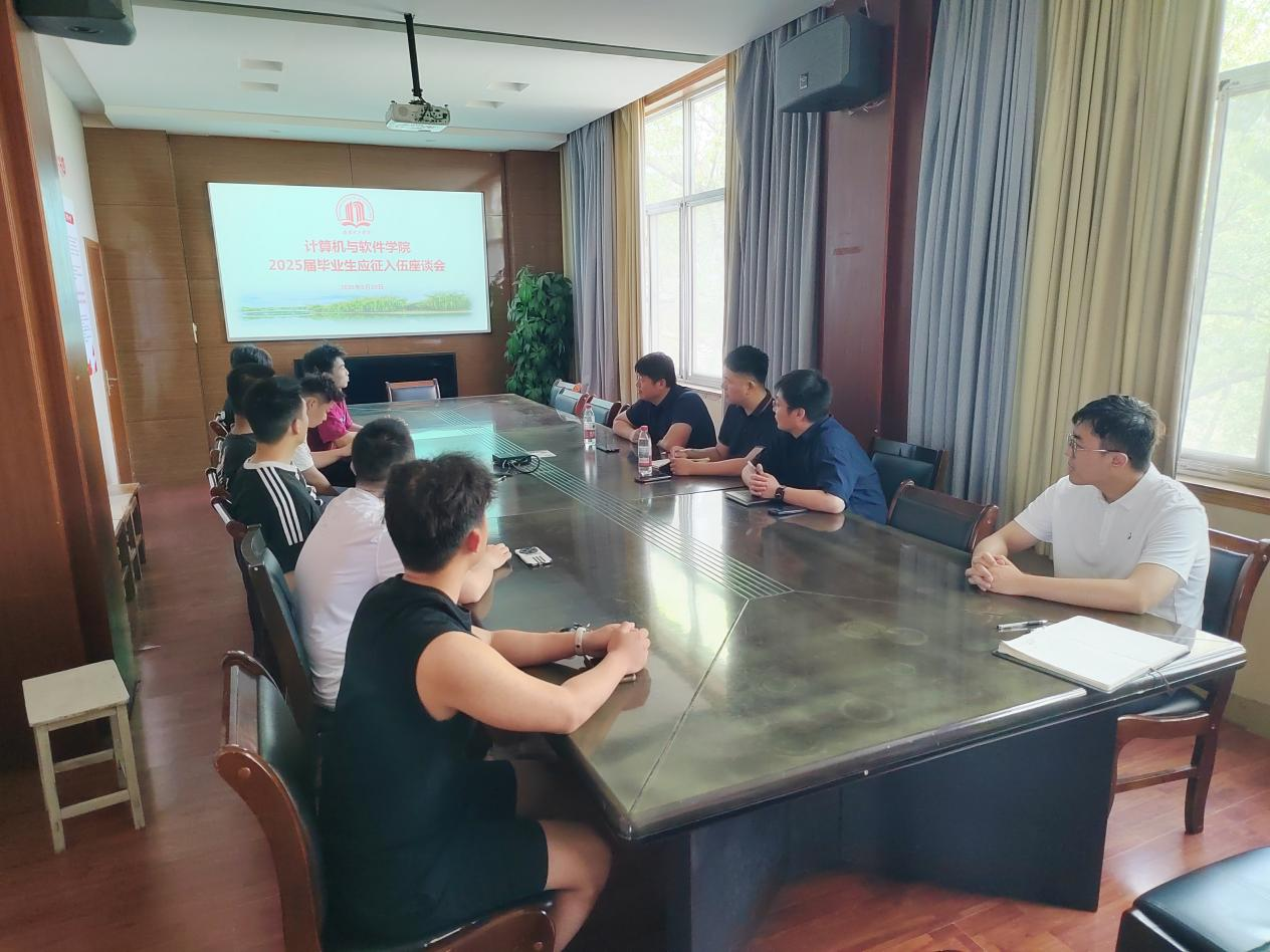 本网讯(特约记者/李洋)5月20日上午,计算机与软件学院在学院二楼会议室召开2025届毕业生征兵工作座谈会。国防教育与征兵办公室主任周密、副主任王文博,计算机与软件学院团学办主任陈旭,毕业班辅导员,以及计算机与软件学院2025届有入伍意向的毕业学生代表参加。