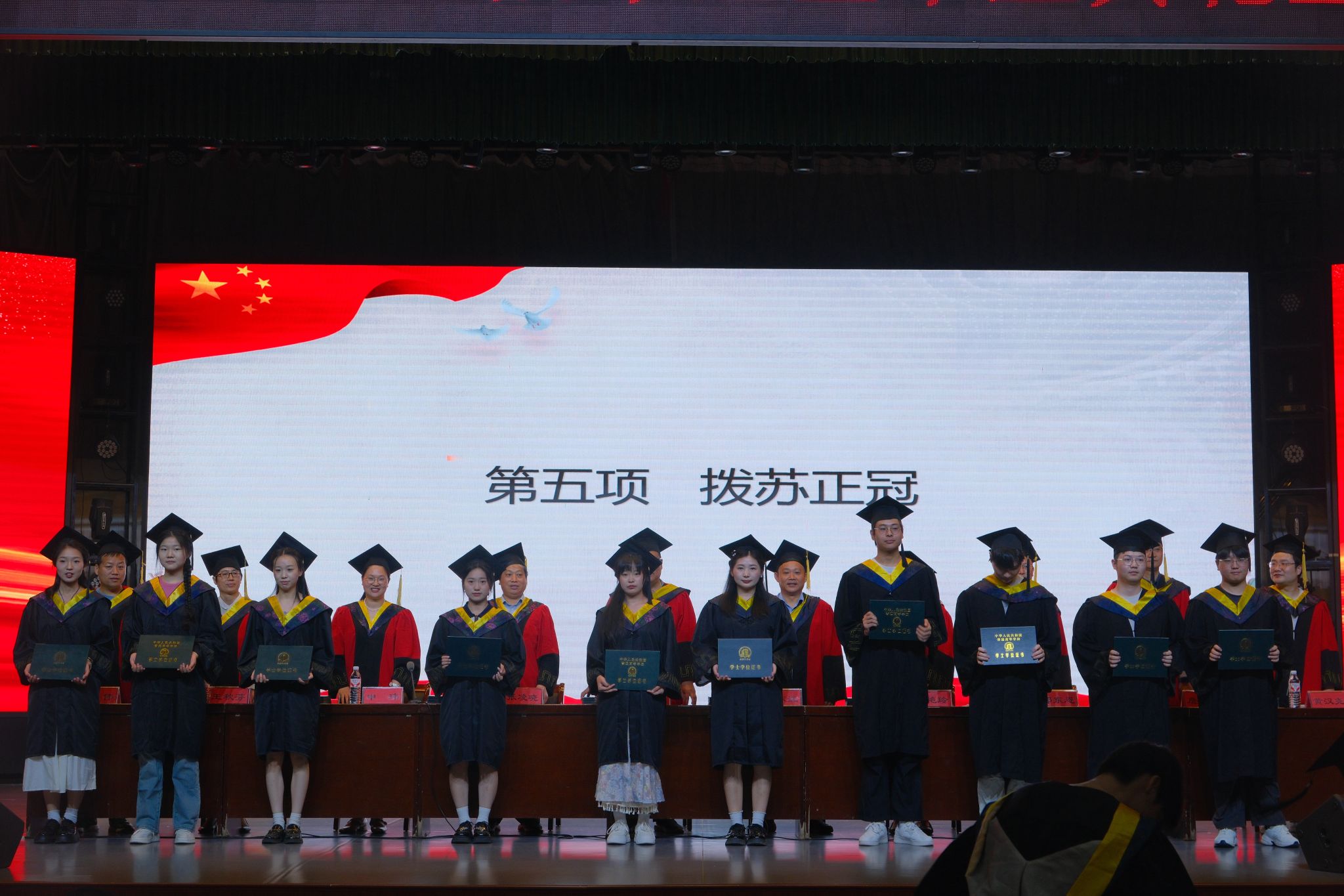 毕业典礼在庄严的国歌声中拉开帷幕,典礼上宣读了2025届省级、校级优秀毕业生表彰名单、毕业生考取研究生名单,学院主要负责人为全体毕业生拨苏正冠、颁发学位证书。