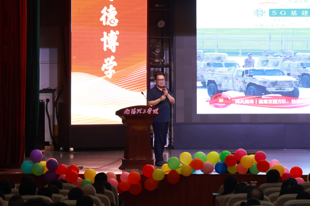开学典礼在庄严的国歌声中拉开帷幕。学院党委书记赵东江致欢迎辞,他代表学院全体教职员工向2025级新生及家长表示热烈欢迎和诚挚问候。他回顾了学院发展历程,详细介绍了学院近几年实施的南工码农 “百千万” 成长工程,在平台搭建、目标驱动、代码赋能等方面,持续提高人才培养质量。同时,赵书记对新生提出 “爱国、勤学、改变” 三点希望:厚植家国情怀,将个人理想融入党和国家事业;珍惜大学时光,自主学习、知行合一,以张云聪、苗栋栋等优秀校友为榜样;勇于自我革新,摒弃“60分万岁”的错误观念,以高学分绩点锤炼学习能力与职业素养,为未来发展积蓄动能。