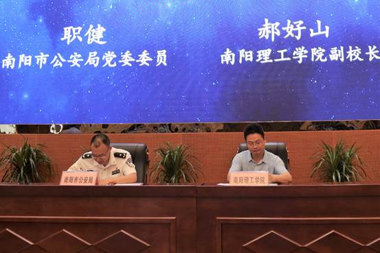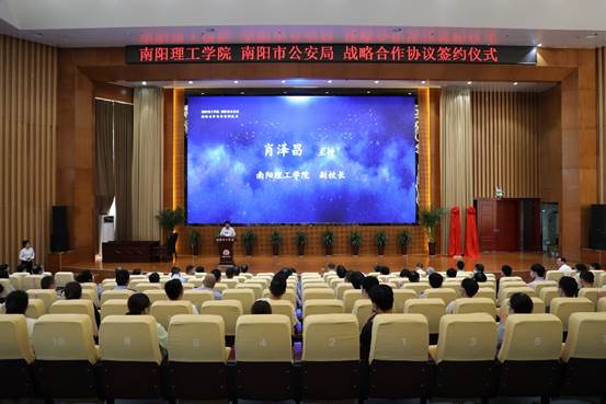 本网讯(特约记者/曾智)6月15日,我校与南阳市公安局战略合作协议签约仪式在第三报告厅顺利举行,南阳市政府副市长、公安局长鲁文明,市委宣传部副部长、网信办主任孙起照,市公安局党委委员职健,市委网信办副主任张晓东,校党委书记刘荣英,校长安士伟,副校长郝好山出席仪式,签约仪式由副校长肖泽昌主持。