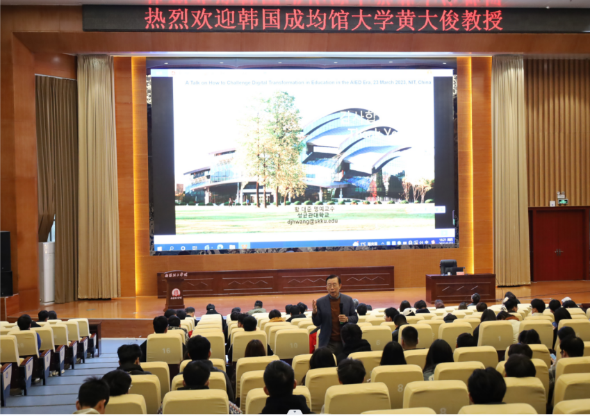 本网讯(特约记者/胡晨曼)3月23日下午,韩国成均馆大学黄大俊教授(南阳理工学院特聘教授)在第三报告厅为全校师生做了“HowToChallengeDigitalTransformationInEducationinTheAIEDEra”(AI赋能时代的教育数字化转型)专题报告,计算机与软件学院领导班子及教师代表,近400名学生代表参加聆听并现场互动交流。
