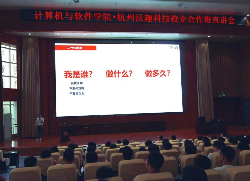 本网讯(特约记者/闫恒瑜)9月18日,为进一步深化访企拓岗行动,计算机与软件学院邀请杭州沃趣科技在我校第三报告厅举办校企合作班宣讲会。学院领导班子成员以及400余名师生代表参加此次活动。