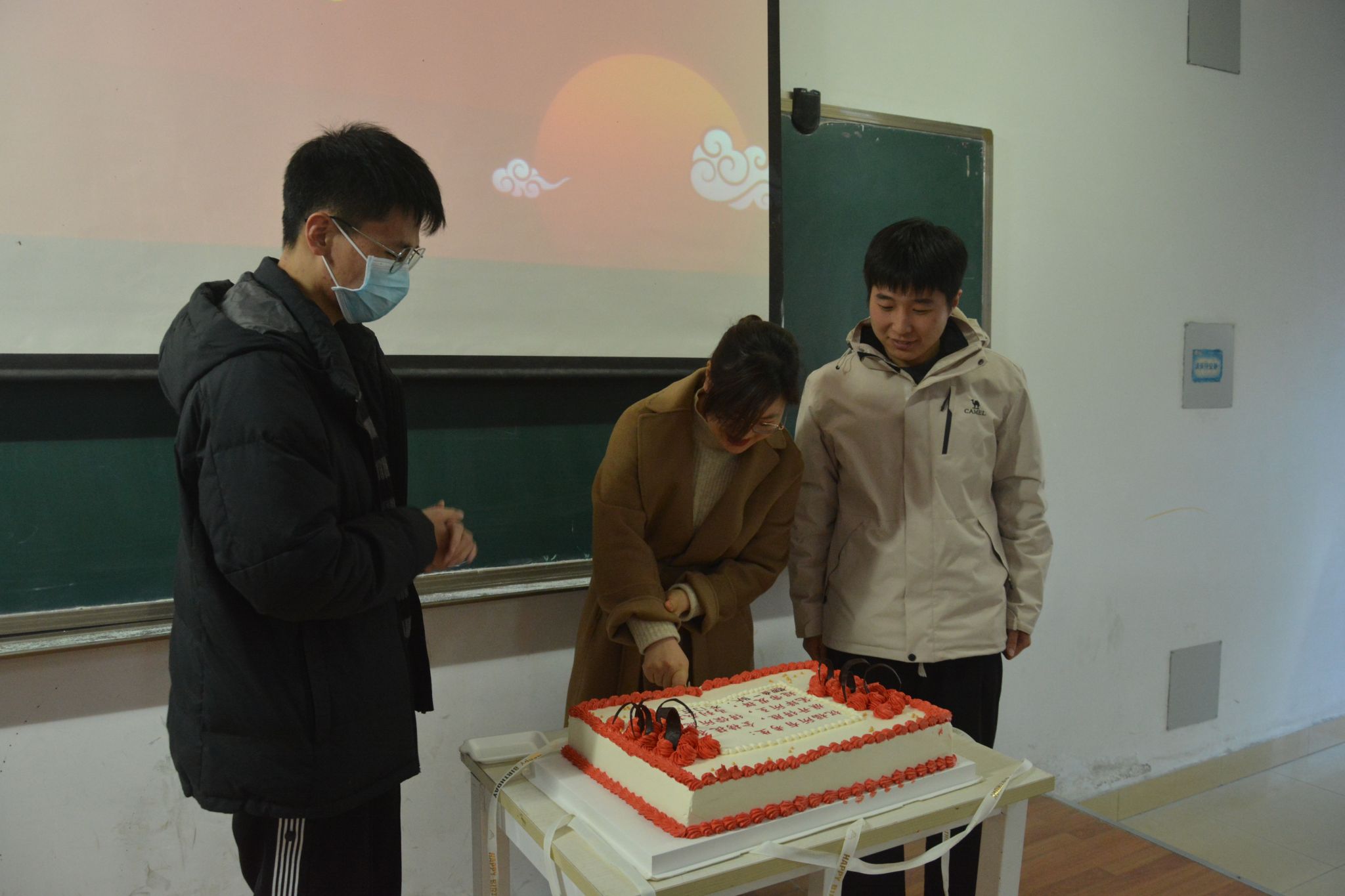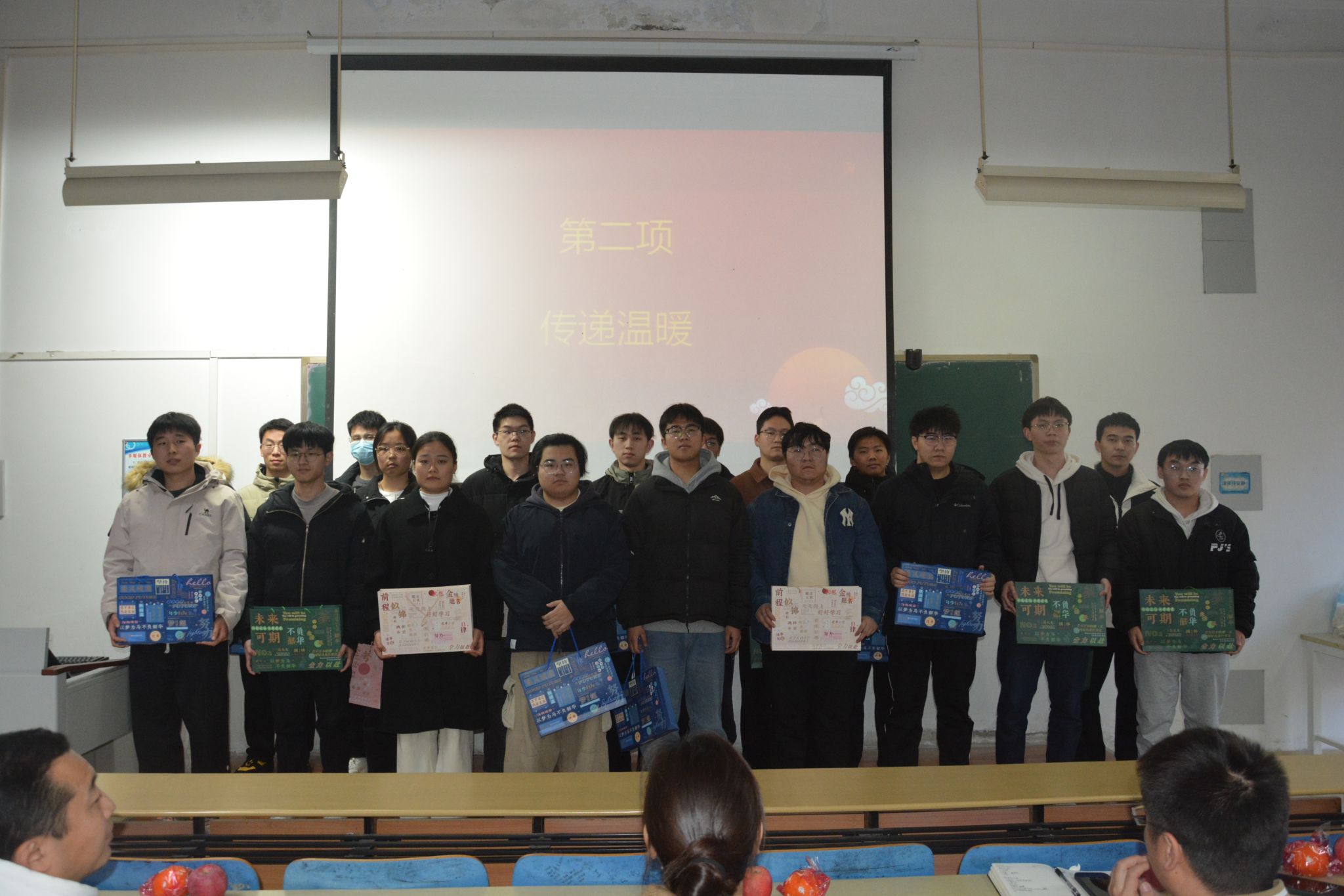 活动伊始,播放了低年级社团学弟学妹们录制的祝福视频。视频充满了他们对考研学长学姐们的深深祝福和美好期望。紧接着,由社团同学向在座的考研同学送上特别的祝福礼品,代表着他们的一份心意,祝福考研学子心想事“橙”,“苹”稳上岸。礼盒中不仅有精美的文具,更有学弟学妹们在贺卡上写下的真诚祝福,为勇于拼搏的考研学子们加油鼓劲!同时,活动播放了一段19级考研上岸的学长学姐录制的视频,分享他们考研最后这段时间的宝贵经验,送上他们真诚的祝福。19级学生是前跃码工作室的负责人王景坤,目前在北京物资学院攻读计算机科学与技术专业。随后,王豫峰老师上台,为考研的同学们送上他的祝福和鼓励。活动最后,申玮老师为考研的同学们切蛋糕,象征着大学生科技园对大家的的希望和祝福。