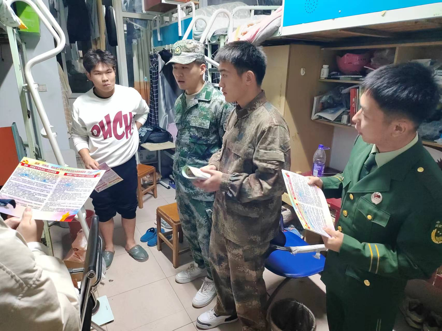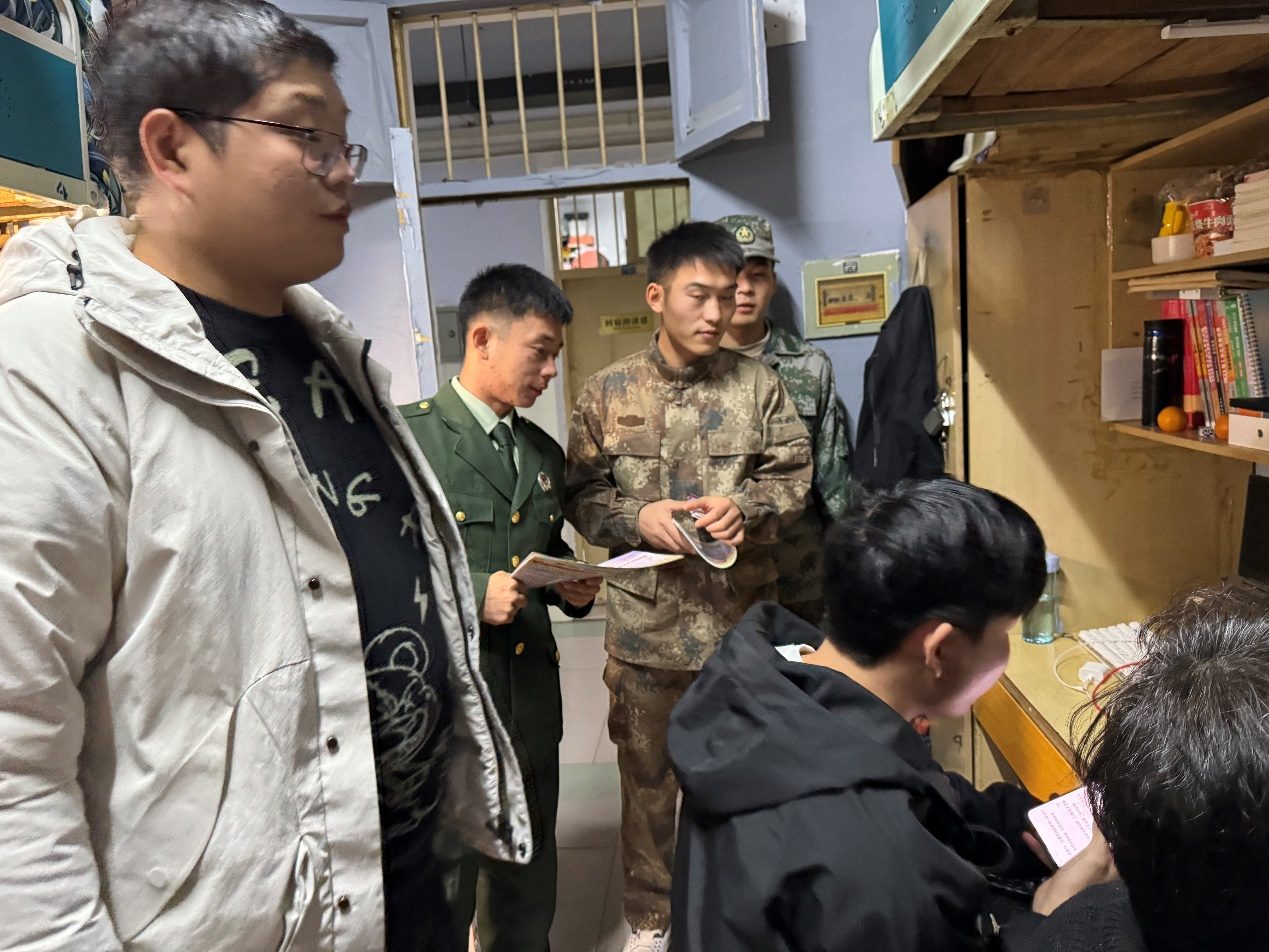 本网讯(学生记者/姜先富)为深入做好毕业生入伍宣传动员工作,激发大学生参军报国热情,12月7日晚,计算机与软件学院武装专干李洋老师及退役军人协会的成员深入宿舍,精准聚焦毕业生开展征兵宣传。