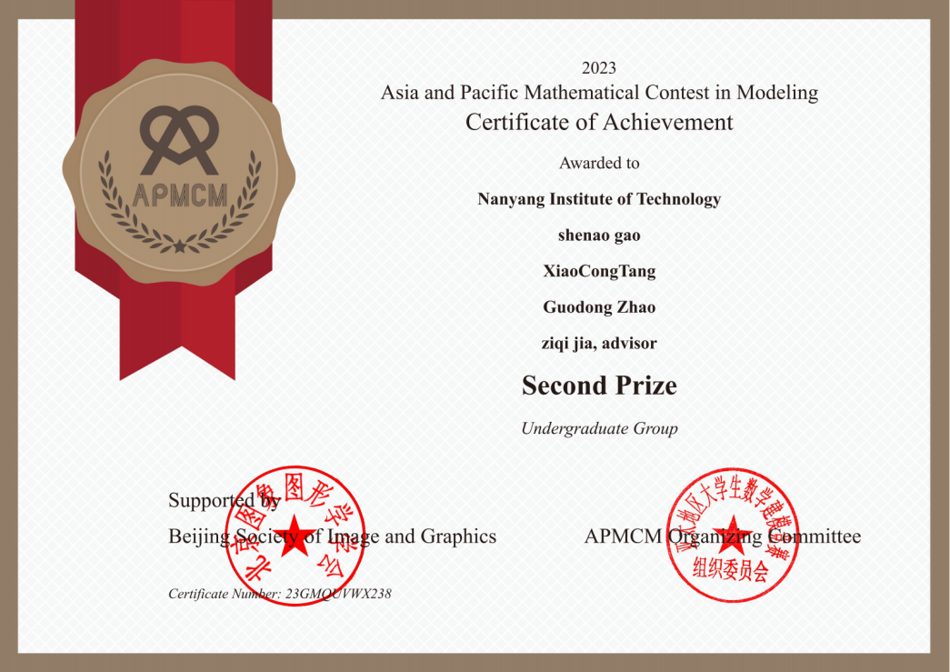 本网讯(特约记者/贾子琪&郭东恩 学生记者/高申奥)第十三届亚太地区大学生数学建模竞赛(APMCM)已于2023年11月23日-11月27日成功举行,本次竞赛共有980所高校2万7千多名学生报名参赛。参赛高校覆盖北京大学、清华大学、浙江大学、同济大学、上海交通大学、复旦大学、四川大学、大连理工大学等全部的39所985高校和114所211高校。除中国大陆高校外,本次参赛队伍还有来自美国、俄罗斯、马来西亚、日本等的高校,我院学子获得本科组二等奖一项。