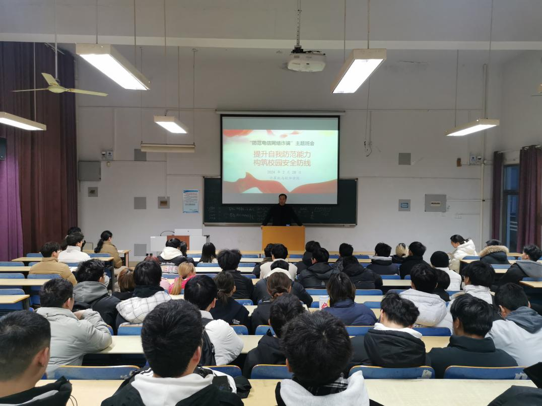 2月28日,学院党委书记祝孔涛以“提升自我防范能力,构筑校园安全防线”为主题讲授开学第一节安全教育课,他围绕诈骗的常见形式以及如何识别、防范电信诈骗等方面进行了精彩的讲解,告诫同学们不要被假象所迷惑,不要贪图小便宜而上当受骗,遇到各种骗局要做到“不听、不信、不转账”,切实提高师生们的诈骗“抵抗力”。