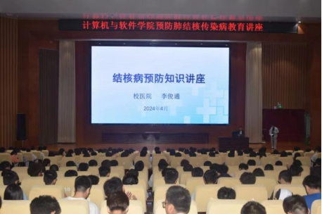 本网讯(学生记者/许石晗)4月25日,为提高同学们的健康意识,增强自我保护能力。计算机与软件学院在第三报告厅举办结核病预防知识讲座。此次讲座邀请了校医院李俊通医师主讲,学院师生代表参加讲座。