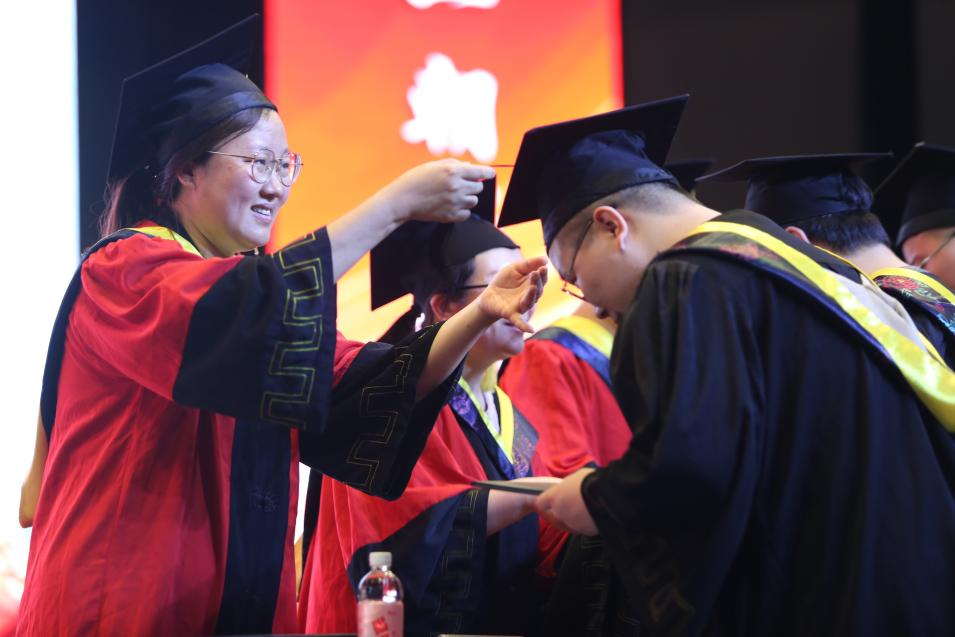 毕业典礼在庄严的国歌声中拉开帷幕,典礼上宣读2024届省级、校级优秀毕业生表彰决定,学院主要负责人为全体毕业生拨苏正冠、颁发学位证书。