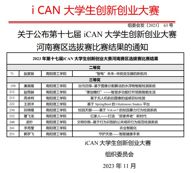 本网讯(特约记者/陈可)11月17日,第十七届iCAN大学生创新创业大赛河南赛区选拔赛成绩公布。我校计算机与软件学院学子经过校赛选拔,初赛作品提交,网评、路演和现场答辩等环节,从全省50余所高校的251支参赛队伍中脱颖而出,获得二等奖1项,三等奖9项的佳绩。