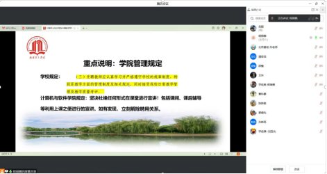 为进一步加强外聘教师管理,计算机与软件学院6月19日召开外聘教师2023-2024-2学期教学反馈线上会议。本次会议内容包括以下几点:本学期课堂教学情况反馈、强调学校及学院对外聘教师管理规定、近期需要完成的重点工作以及下学期外聘课程公布。