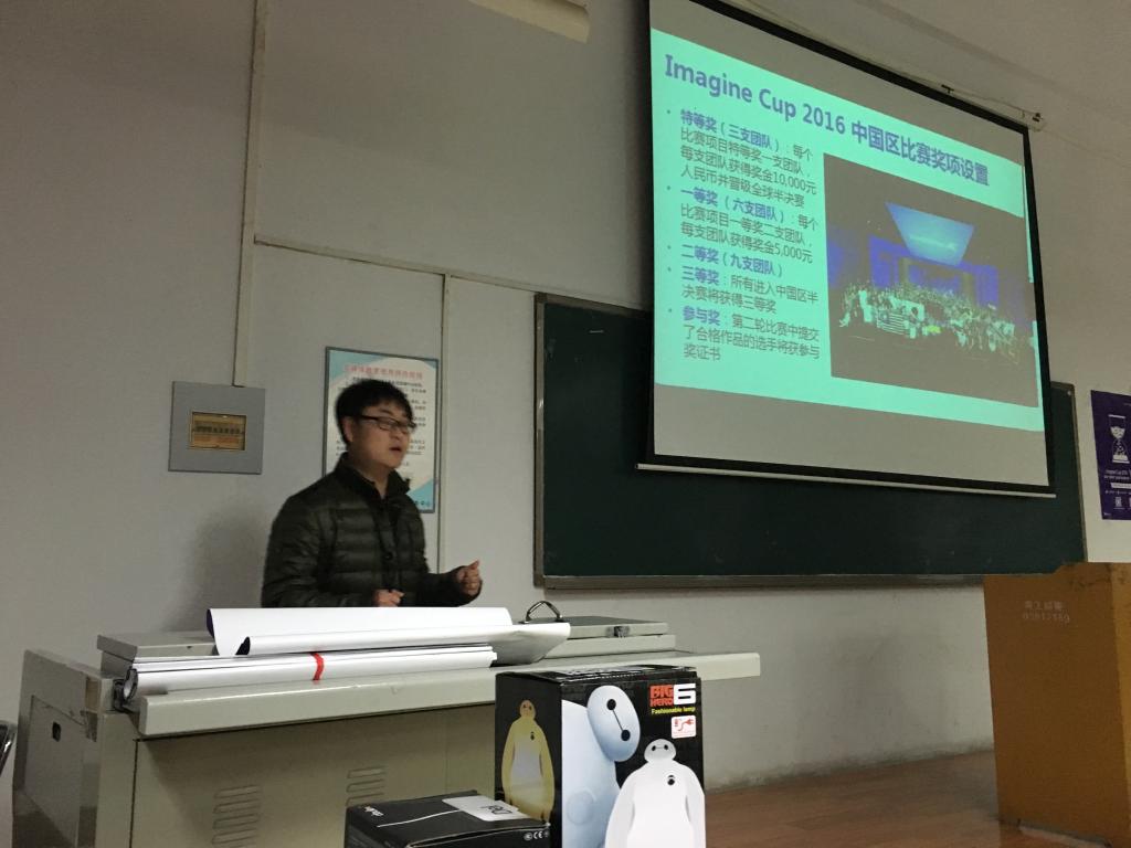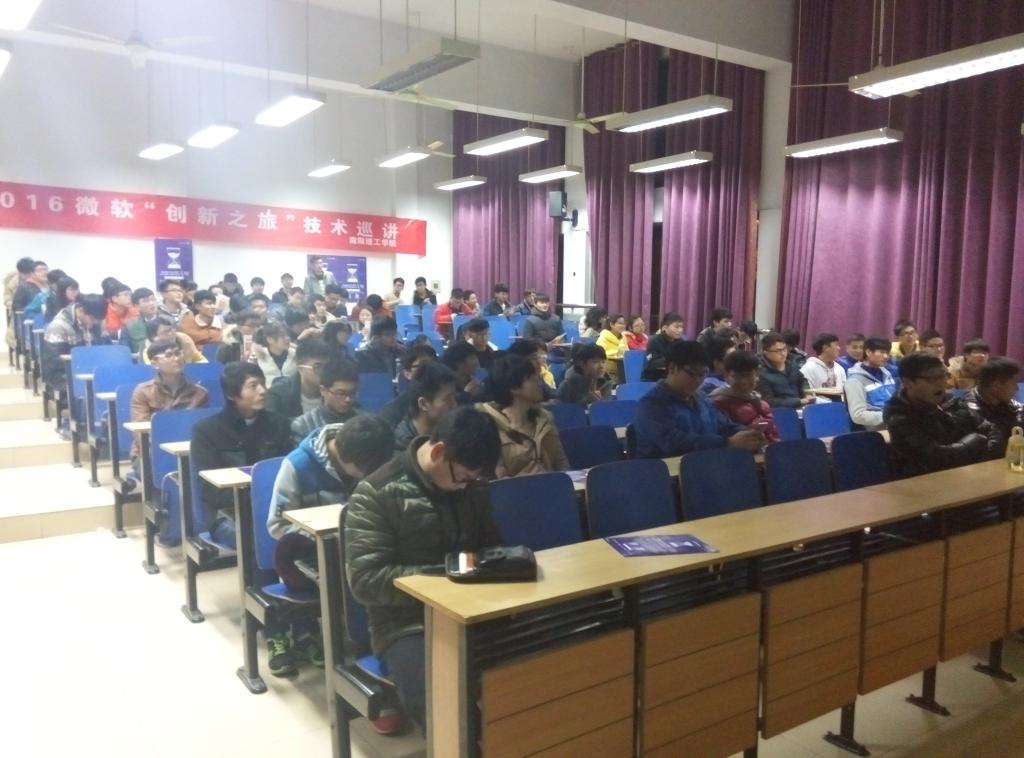 12月7号南阳理工学院软件学院在14#106教室成功举办了2015-2016年微软创新杯校园之旅活动。本次活动由微软中国有限公司主办,南阳理工学院软件学院承办,由微软教研室协办。该活动得到了校方的肯定和支持。