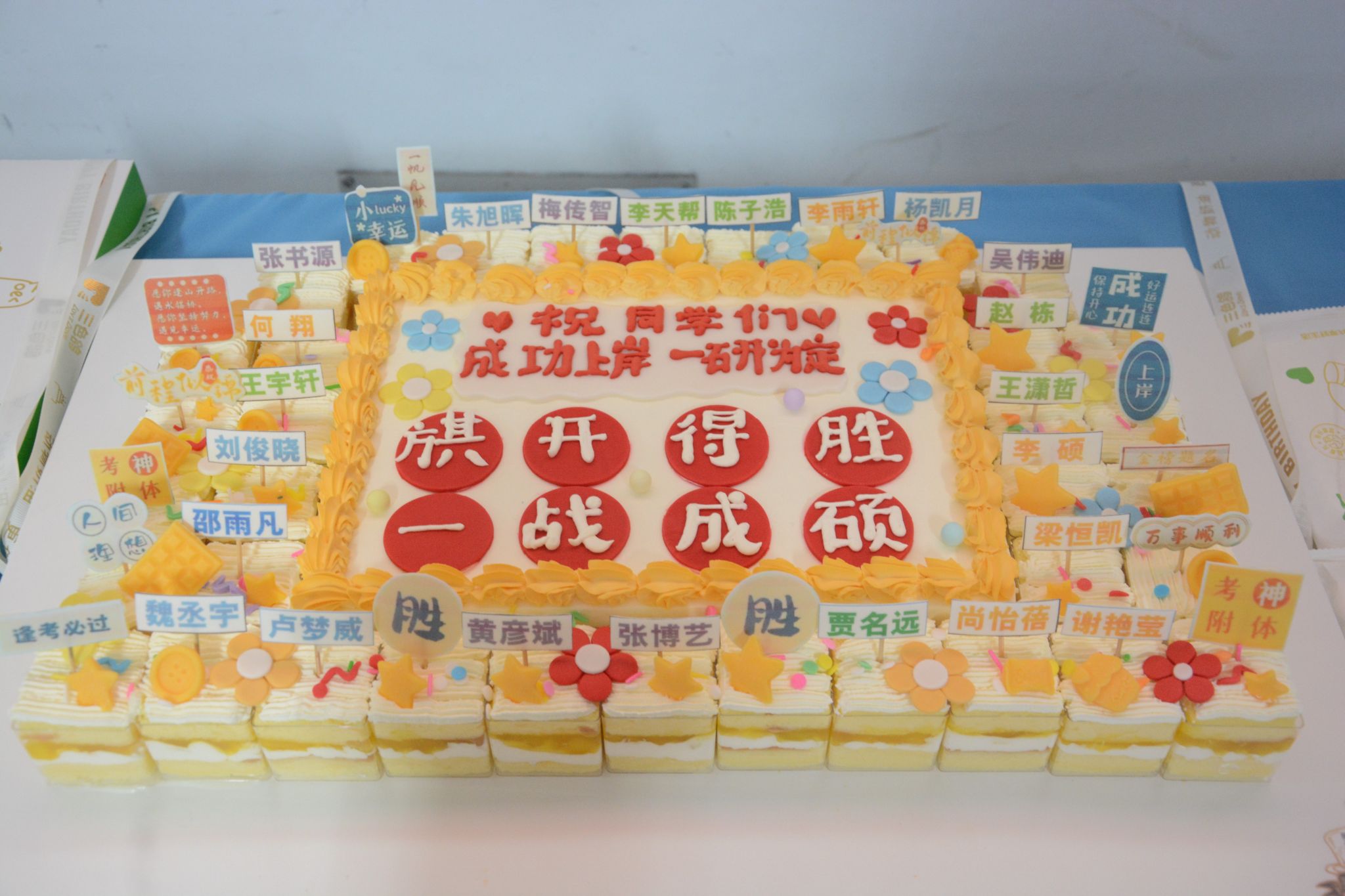 礼品赠送环节成为活动的暖心亮点。苹果寓意“苹”安顺遂、橙子象征“橙”风破浪,搭配实用的眼罩、文具、甜甜的糖果与旺仔牛奶,还有象征向阳而生的向日葵,以及学弟学妹亲手书写的祝福贺卡,每一份礼品都承载着学院的用心与期许。老师们依次为考研学子送上“备考能量包”,并与学子们合影留念,定格下这份师生同心的温暖瞬间。活动尾声,工作人员推上印满全体考研学子名字的“圆满上岸”主题蛋糕,老师们共同切开蛋糕,将甜蜜的祝福与成功的期许传递给每一位学子,现场氛围达到高潮。