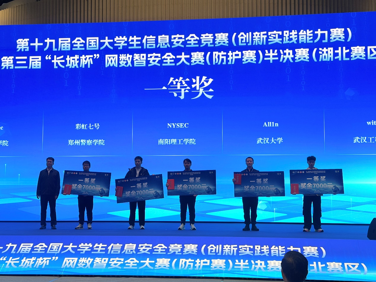 本网讯(特约记者/林玉香 姚琪)3月22日,第十九届全国大学生信息安全竞赛(创新实践能力赛)暨第三届“长城杯”网数智安全大赛(防护赛)湖北赛区半决赛,在东西湖区国家网络安全人才与创新基地会展中心圆满落幕。南阳理工学院NYSEC战队凭借出色表现,斩获一等奖、二等奖各一项,其中一等奖队伍成功入围全国总决赛,彰显了学校网络安全人才培养的扎实成效。