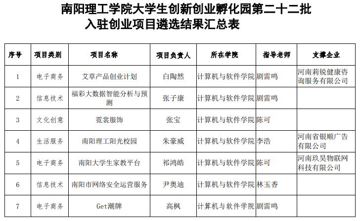 根据《南阳理工学院大学生创新创业孵化园管理办法》(南理工院字〔2018〕166号)的要求,学校招生就业处于2023年4月7日,组织开展了申请入驻大学生创新创业孵化园第二十二批创业项目遴选评审工作。