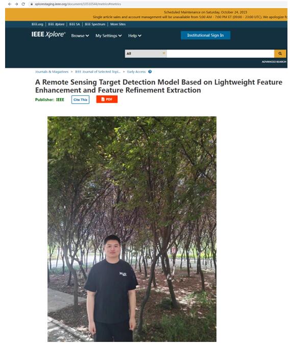 本网讯(学生记者/孙振)近日,我院2021级软件工程专业(智能软件开发方向)学生、校百度菁英班负责人周卓柯同学在中科院SCI二区期刊《IEEE Journal of Selected Topics in Applied Earth Observations and Remote Sensing》(IF=5.5),发表题为“A Remote Sensing Target Detection Model Based on Lightweight Feature Enhancement and Feature Refinement Extraction”的研究论文。该论文在郭东恩教授的精心指导下,成功录用,录用期刊影响因子5.5。
