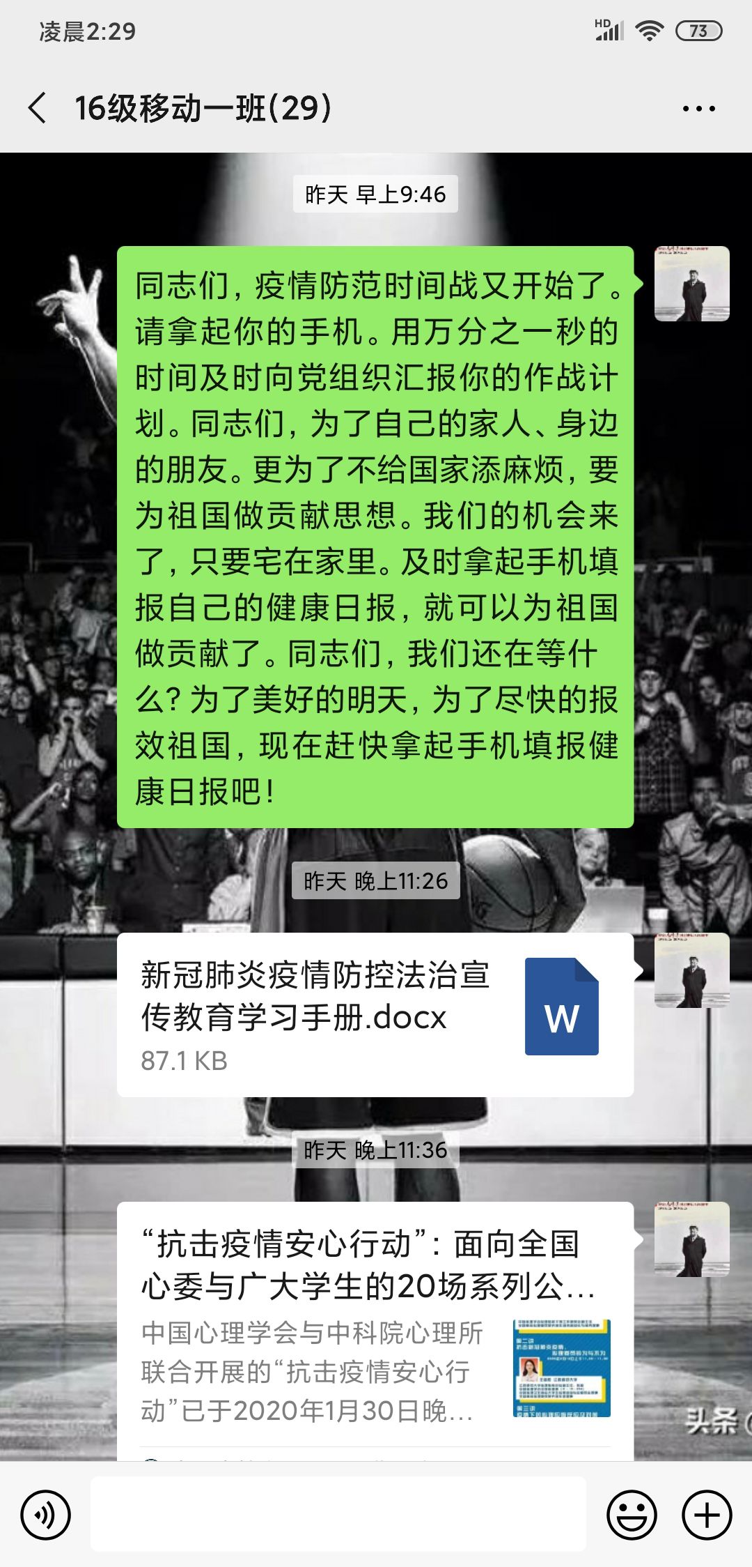 根据学校的统一部署,春节前后,辅导员老师们及时了解学生思想动态,积极向学生转达各类通知和疫情防控知识,及时开展各类宣传教育。