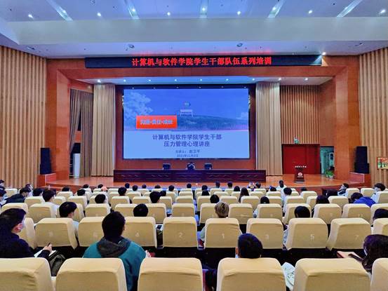 本网讯(特约记者/曾智 学生记者/柴静怡)为进一步加强团学组织建设,提升学生干部组织管理能力、创新实践能力等综合素质,我院开展学生干部系列培训,11月2日晚,邀请心理健康教育中心主任赵卫平在第三报告厅开展压力管理心理讲座。我院党委书记祝孔涛、副书记申玮、团学办主任孙文平、副主任陈旭,全体辅导员及学院全体学生干部参加此次培训。