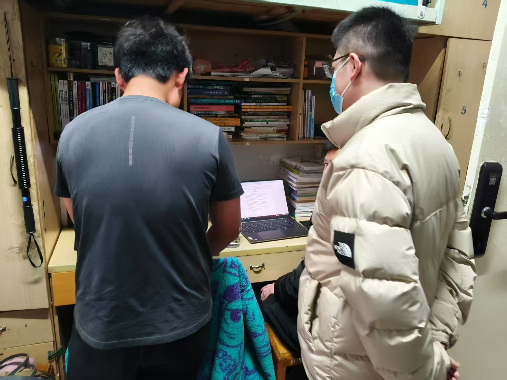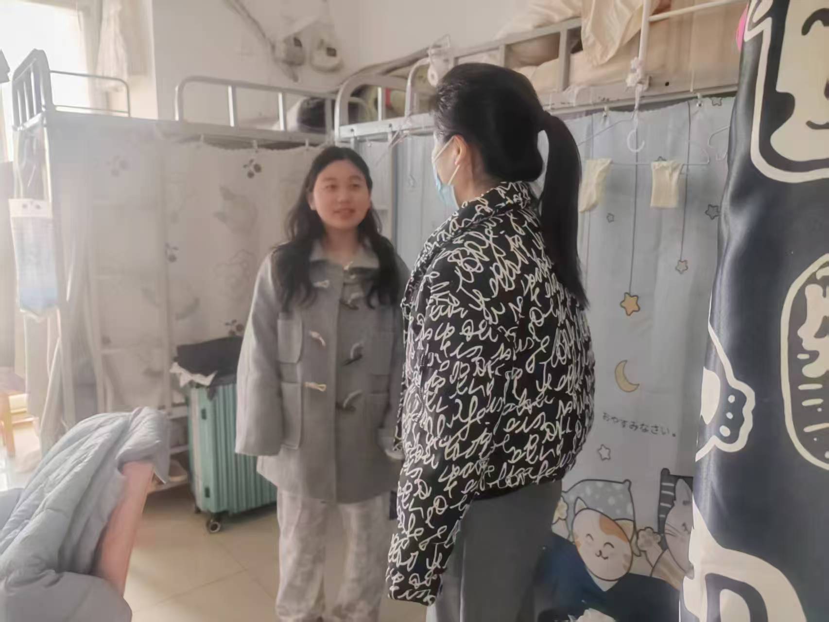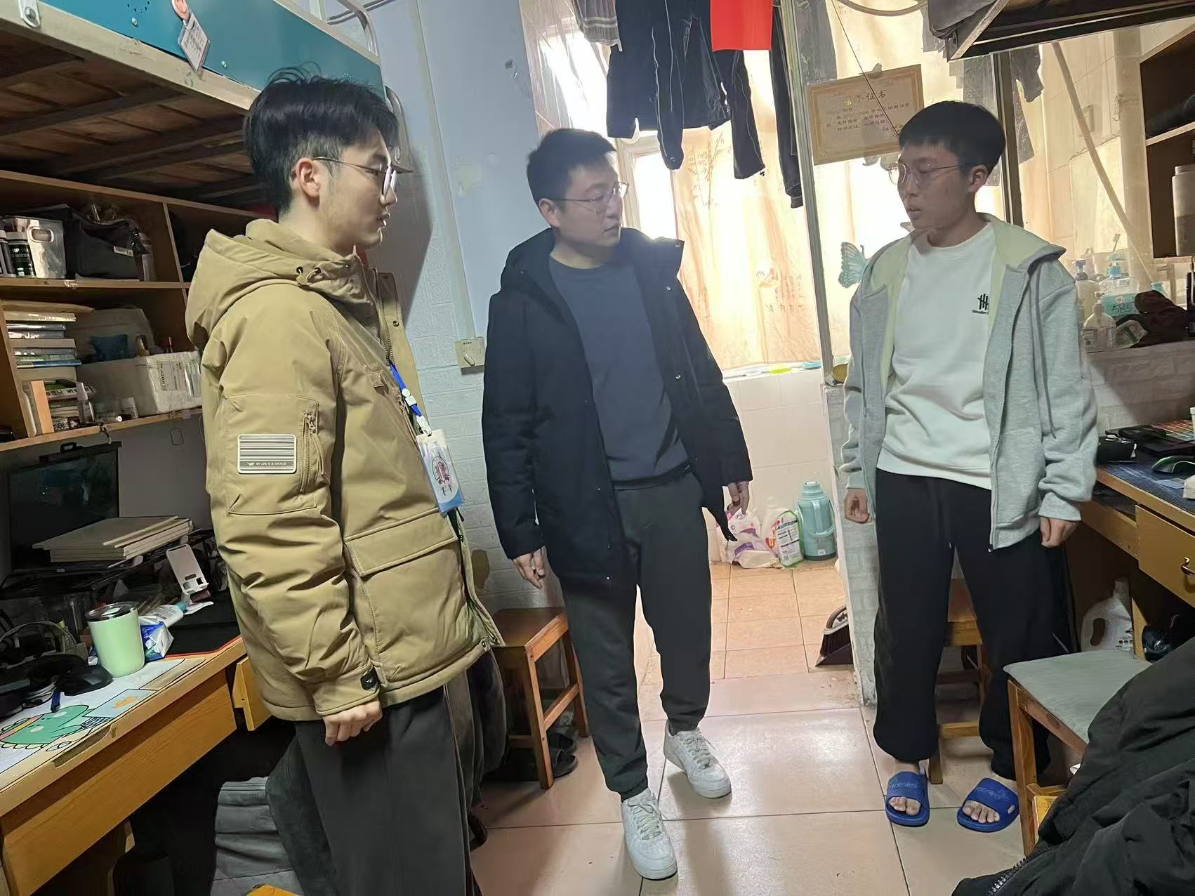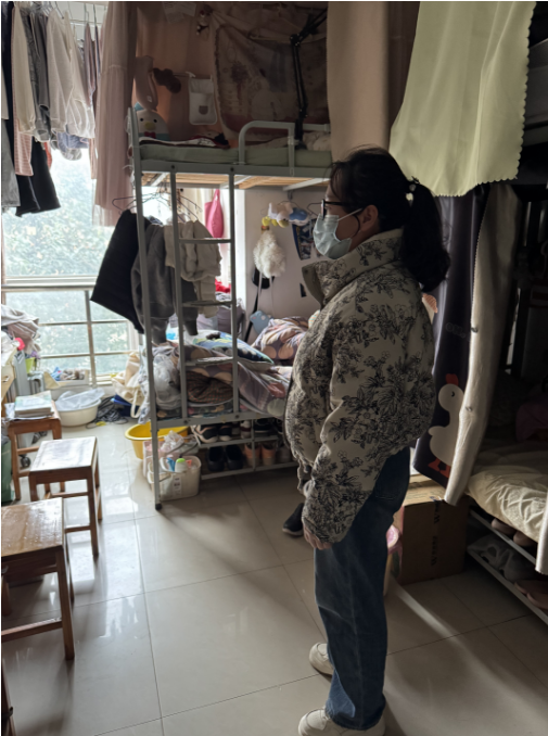 在走访宿舍过程中,老师们仔细查看了学生宿舍内务整理、卫生安全以及通风消毒等情况,向同学们传达了春季传染病预防的重要性。老师们还与学生亲切交流,询问大家的学习生活情况,倾听同学们的需求与建议,同时也鼓励学生们勤勤恳恳地学好专业基本知识,扎扎实实地掌握好科研实践操作技能,在此基础上也要切实保证自身作息与饮食规律,劳逸结合,要走出宿舍、走向操场,积极进行体育锻炼。