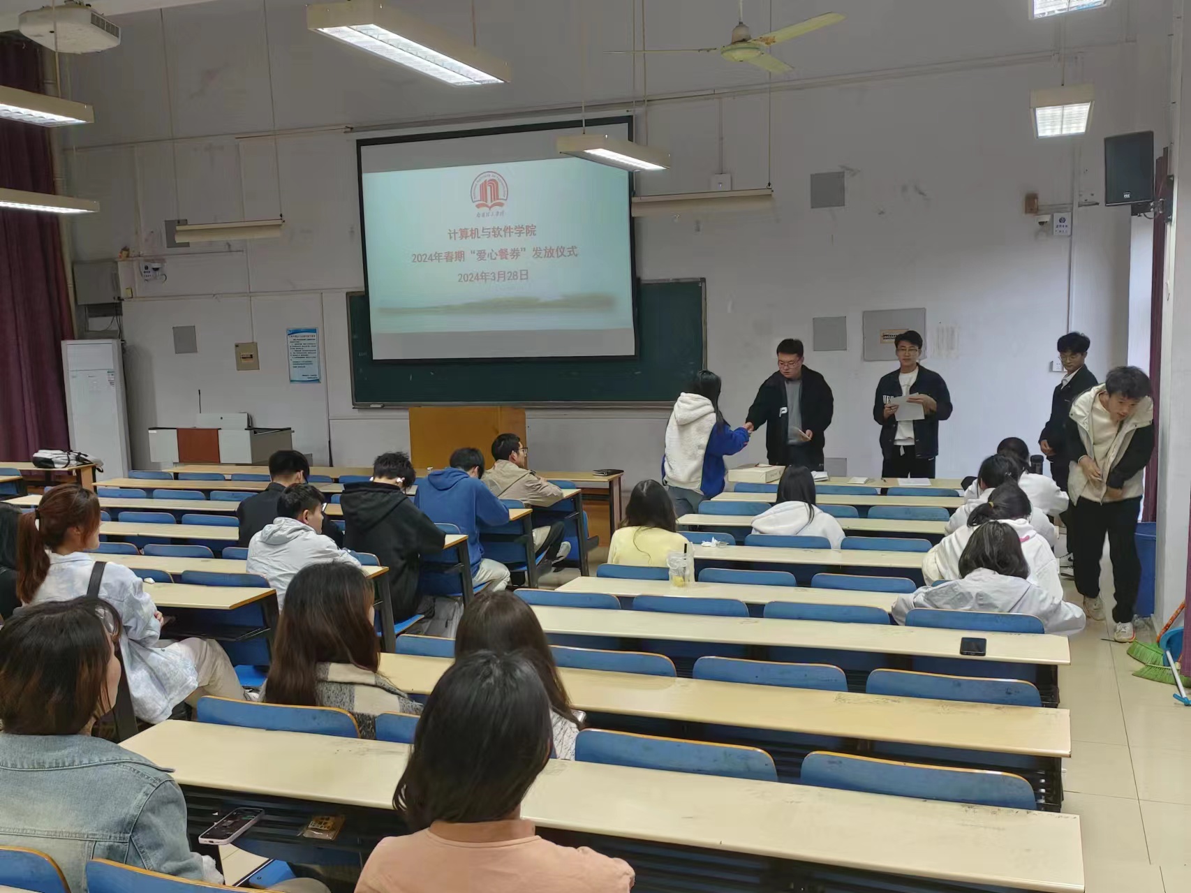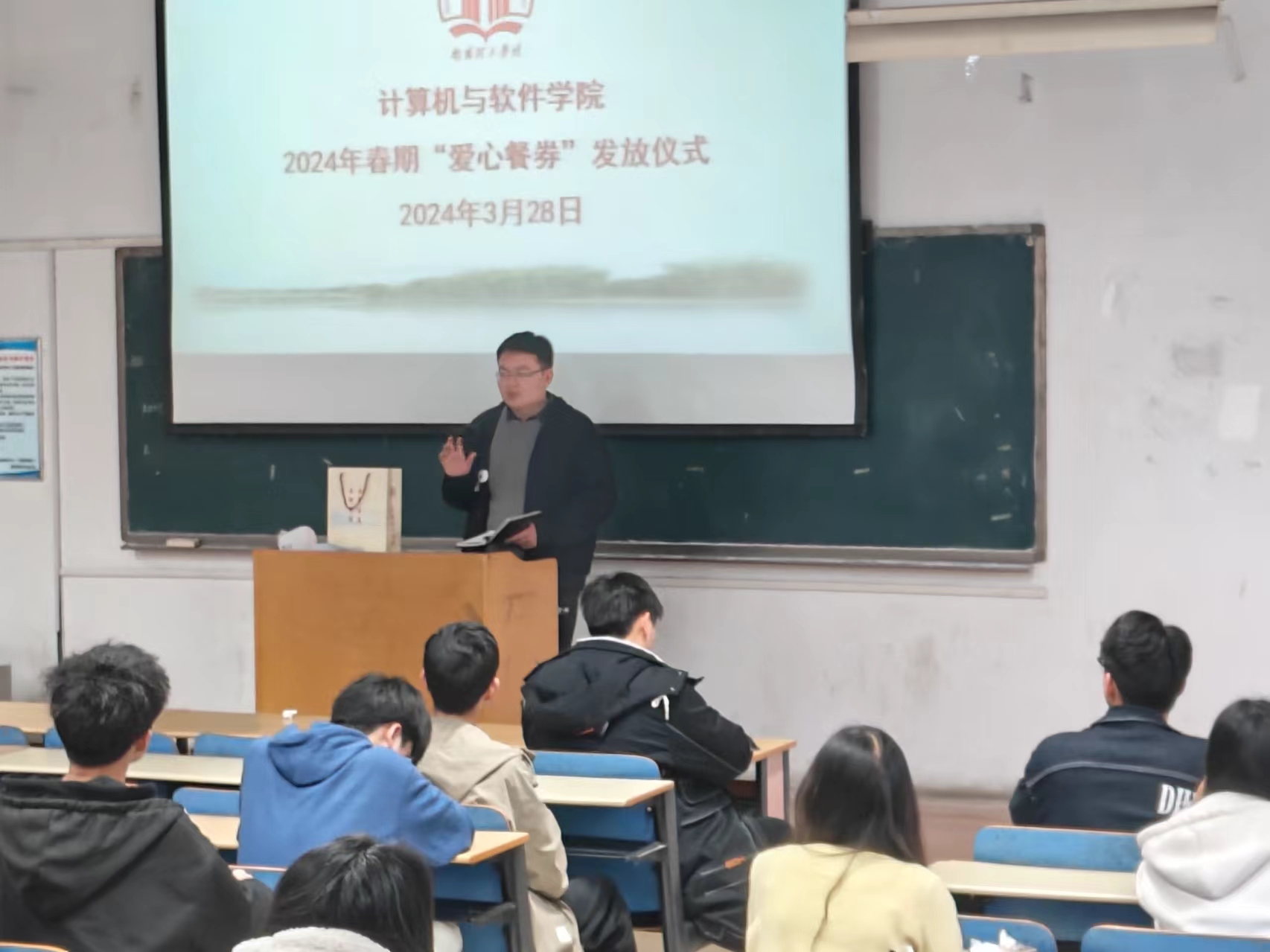 我院严格遵循公平公正原则,充分核实学生的受助条件和实际需求,以资助国家重点保障人群为主,遴选出家庭经济特别困难的学生代表共计57人,于3月28日下午在14号教学楼102教室举办2024年春期“爱心餐券”发放仪式,学院资助专干老师余帅,餐券受助学生参加。